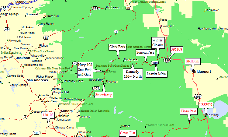 Tioga Pass - Hwy 120 Kennedy Meadows - the northern one Leavitt Meadow pack station and hiker trailhead Sonora Pass Gate - winter closure Sonora Pass proper and St Mary Pass Clark Fork road SnoPark - west winter closure