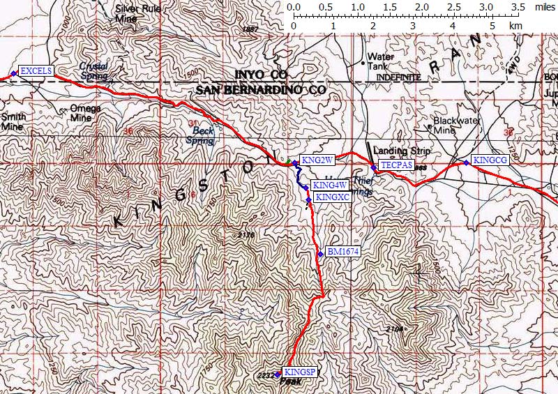 Bear left at the saddle (waypoint KINGW3, only 0.4 miles from Excelsior Mine Road)