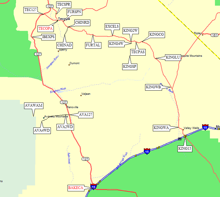Most people will probably approach via I-15, heading north from Baker (waypoint BAKECA) on Hwy 127 for Avawatz and the other peaks (except Kingston) below, or north on Cima Road (waypoint KING15) for Kingston. Only those who intend climb BOTH Avawatz AND Kingston are likely to traverse Tecopa Pass (waypoint TECPAS), which connects these two southern approaches via Tecopa (waypoint TECOPA).