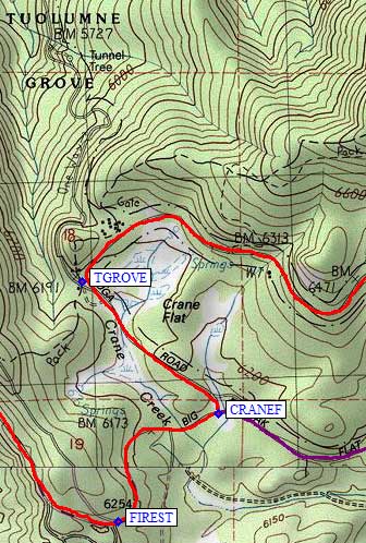 Crane Flat (waypoint CRANEF) is the junction where Hwy 41 (the purple line from Fresno, via Yosemite Valley) ends at Hwy 120 (the red line). The filling station here is open more often than the one in Tuolumne Meadows. There is a tourist trailhead for the Tuolumne Grove (waypoint TGROVE) immediately south of the environmental education campus at Crane Flat. In the summer this is big trees and big crowds. In the winter, this is a quiet cross country trailhead parking area where you can snowshoe or ski down to the same big trees without the big crowds. It can be a slog back up to the parking area. Hwy 120 is gated here (waypoint TGROVE) for the winter, and there is free legal overnight parking, so you can also ski up the road. |