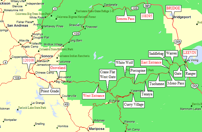 Hwy 120 is closed in winter from the Tuolumne Grove parking area (waypoint TGROVE) north of the filling station at Crane Flat to a gate near Lee Vining (waypoint LEEGAT) where the power station road leaves Hwy 120 in Lee Vining Canyon. The ranger station near Lee Vining (waypoint LVRANG) no longer serves the public, and the Mono Basin Visitor Center (waypoint MONOBV) seems to be closed some or all of the winter.