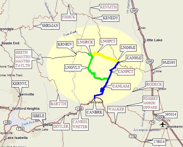 Nine Mile Canyon Road connects Hwy 395 (waypoint 3959MI) to Kennedy Meadows (waypoint KENEDY). Roughly halfway (12 miles from each end) there is a major intersection with a Chimney Peak Rec Area monument but nothing that says what road it is (waypoint CAN9MI). This would be the northern end of Canebrake Road, which may be called Chimney Basin Road between here and the Chimney Creek Campground (waypoint CHMCMP). Nine Mile Canyon Road is usually plowed in the winter, but Canebrake and the Sherman Pass Road beyond Kennedy Meadows are not.