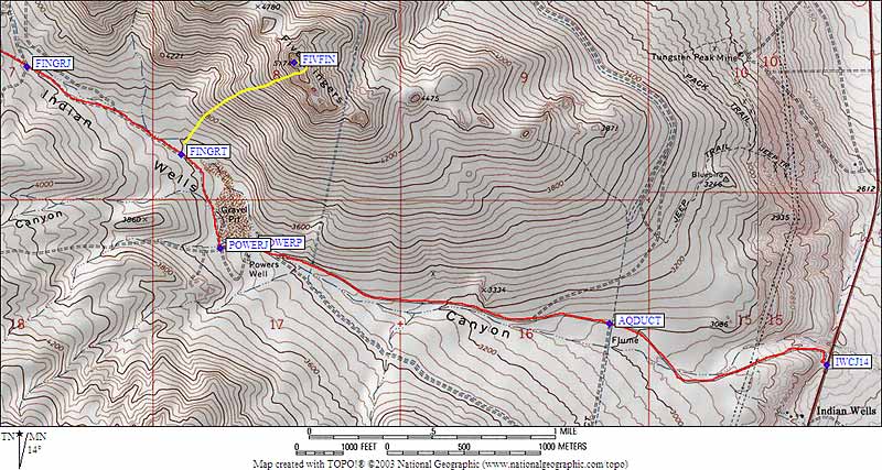 Go 2.7 miles up the main dirt road (SE152, Indian Wells Canyon Road), to "Powers Well" and the junction with SE164 (waypoint POWERJ). Just before the junction, there is an old square rock-walled cistern near a small cofferdam on the left (waypoint POWERP). It's another great place to meet because it has a parking lot and a sign of some sort. Turn right at waypoint POWERJ and go up the west side of an old gravel pit at about 3500' elevation. After Powers Well, continue northwest in the main drainage, staying to the left of the channel that often has flowing water. The trailhead for Five Fingers is at waypoint FINGRT, a circular parking area downhill from the road and just under half a mile north of the turn at POWERJ. This is as far as passenger cars may want to go, depending on the road conditions during any given year.