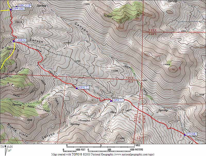 At 4600' (waypoint OPJCT2) you cross another minor drainage and continue on what the topo map shows as a jeep trail instead of a dirt road. Here there is a fiberglass sign saying only "OP" at the bottom. Once again you turn right. Once again the road gets a bit worse.