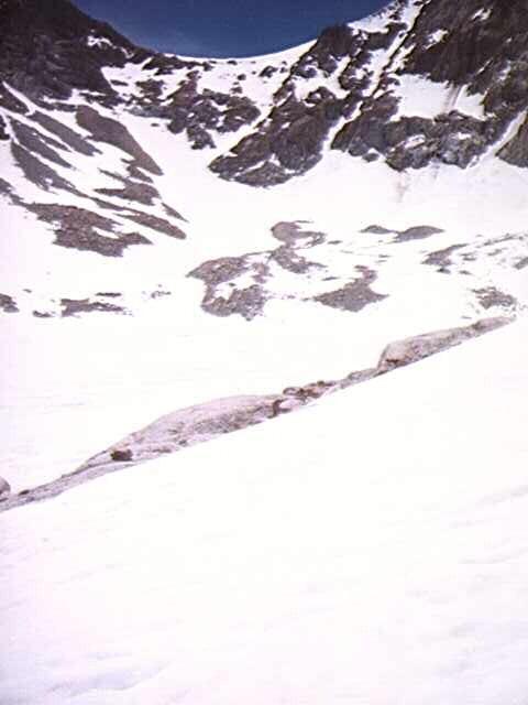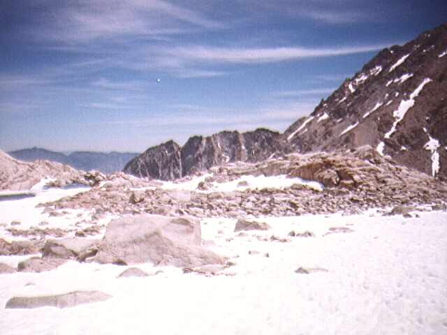 We passed Trail Camp and then everything went to hell. Ryan's rigid boots were now more of a nuisance than an advantage because of the mixed sludge/talus we were on. My Vasque Alpines were right at home and I felt great. Whitney was out of the question as we were over an hour late (based on the backpackers' recommendation) and were post-holing like mad. Ryan decided to wait on a small bench. Two years ago he waited in the same area for me as I climbed the bowl and ascended Whitney and Muir getting mild altitude sickness in the process. I decided not to push it again by myself and so headed north to the west face of Wotan's Throne, which was completely free of snow. Wotan, Whitney, what's the difference? I followed the small stretches of exposed rock as much as possible but I eventually ran out of ramps and hit the snow. Bad Idea. I immediately began sinking knee deep, but my gaiters (which have been a problem in the past) kept me dry. I aimed for some outcrops poking through, hoping to speed things up, but I was traveling at a whopping .5 miles per hour, which meant Wotans was at least a 3 hour commitment. Luckily the last big bench before the bowl was snow free, so I took it north, resisting the urge to continue west up to Trail Crest.