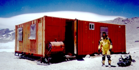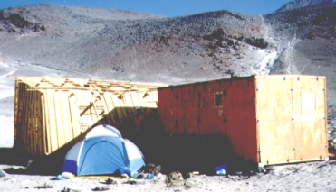 Since there was nothing we could do about the weather, we carried water and fuel up to the Tejos Refuge (at about 19k, see waypoint HUT19K) on day 8. This 2000' climb takes about 3 hours up and one hour down, and some people wanted to turn around right away because they felt worse after resting than when they first arrived (another sign of incomplete acclimatization - you should feel fine resting at whatever altitude you climb to). This L- shaped hut is constructed from very solid steel shipping containers welded together. It once had solar cells, fluorescent lights, a shower fired by a fuel oil heater, etc., but the fancy stuff has all broken since it was built in the 1980s. The windows are intact, and there is often silty water within walking distance.