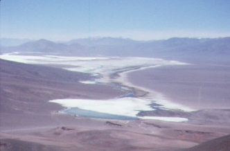 Later we found out that the Carabineros (police?) station has been moved from near the Hosteria L Murray ruins to Laguna Verde, and that we should have left our passports with the Carabineros while we climbed. Oops. The International Highway has been re-routed since two years ago, and now bypasses the old (abandoned, see waypoint CARABA) Carabineros station. The new station on the lakeshore (see waypoint VERDEC) is a huge improvement, but 20km out of the way. The fabled hot springs at Laguna Verde (waypoint VERDEH) are inside a tiny shack that looks filthy from the outside. Skip them. None of us went in, and we saw no flamingoes there. Someone has assembled several horse-type collections of bones on the shore, and it was fairly crowded with people.
