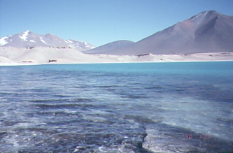 284km: Laguna Verde - drive along lake [VERDEW] for a ways, follow good road to shore - turn left and go down to hot springs [VERDEH] and new carabineros station [VERDEC] - need to show climbing permit here, and leave passport
