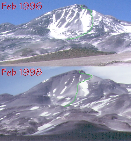 I've included pictures from 1996 (when we didn't make the summit) and 1998 (this report) to illustrate the difference in snow cover. I've marked the route we took on each trip. For context, there is a map of Chile at the bottom of this report.