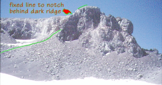 The "fixed" rope (free at one end) could be flipped onto a sheer face, or over onto easy 3rd class rock. There is about 50' of climbing, then another 50' of scrambling to the summit. I've heard reports that this is class 5.2 climbing, but either they were off route or too tired to rate it properly. We all agreed it would have been safe to climb with no rope (even in plastic boots) at lower elevation, but everyone ran an ascender or a prussik up the rope just in case. No one wanted a belay, but I rapped off to save time after watching the others downclimb while holding a prussik knot open with one hand. (I'm not sure the reflex to grab the rope would allow opening your hand in the event of a fall - cavers have tested "let go to lock up" safety devices and concluded that the urge to tighten your grip during a fall is too strong.)
