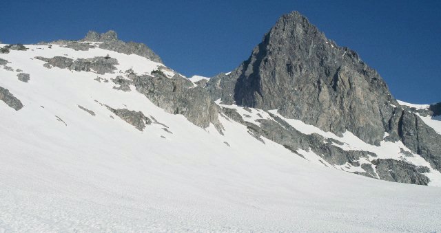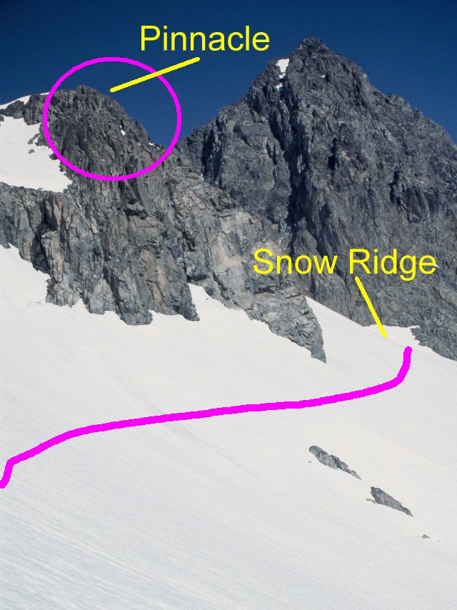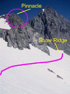 snow up by the pinnacle. Then cross over the fairly steep ridge of