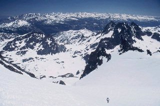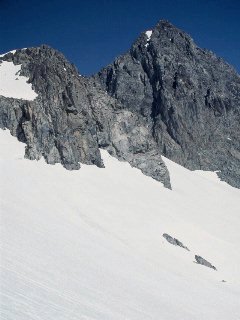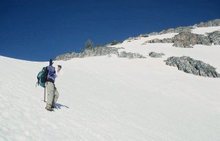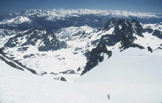 | The remainder of the southeast glacier was an easy snow slog through moderate to deep sun cups up past the "three-toed" buttress and making a sharp right turn into Owen's chute. The chute is rather steep but straightforward, and there was all of 15' or 20' of bare scree at the top to be negotiated before hitting the upper bowl leading up to the summit of Mt. Ritter. | |