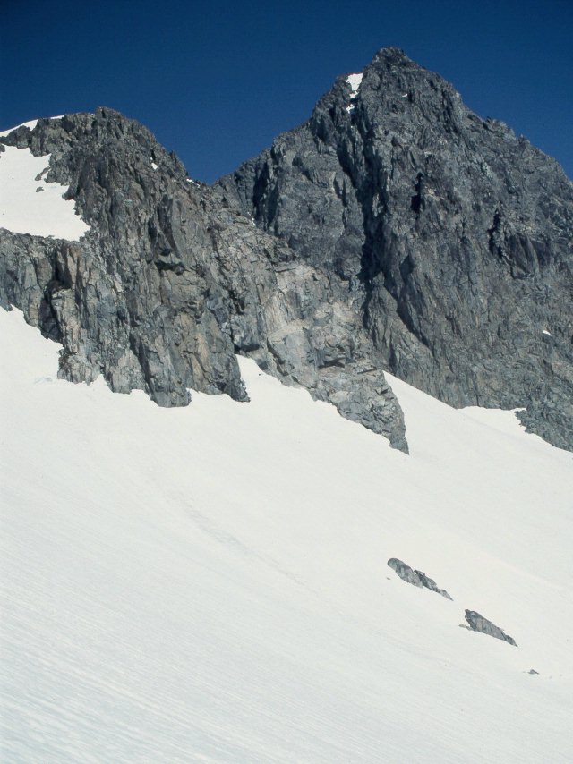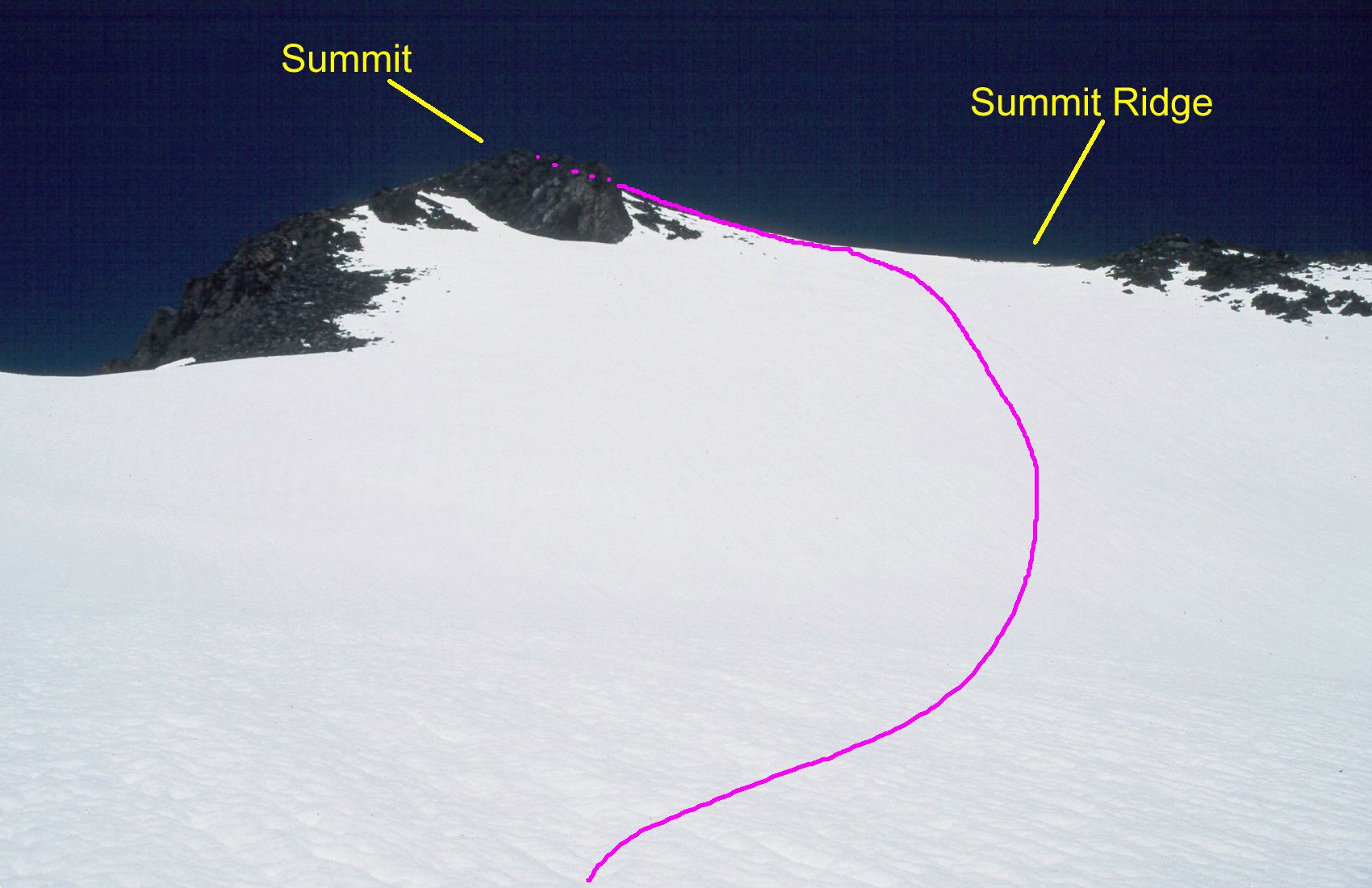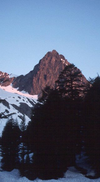 | Disclaimer: Mountaineering poses significant risks. The route description which follows is not meant to train anyone in climbing techniques. If you fall off the mountain and break your fool neck or any other part of your anatomy, do not send your lawyers, heirs, etc., after me, the Peak Climbing Section, or whomever. You decided the rewards were worth the risks and you accepted those risks when you left the trailhead. |