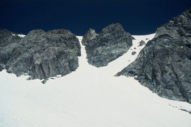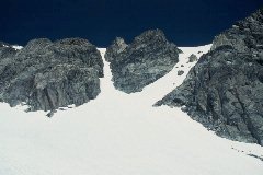 Reports I've heard say that the headwall of snow at the top of the right-hand chute can be a little intimidating but is not terribly difficult. Other than that, either the first or third chutes are walkups with ice axe and crampons. |