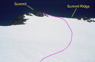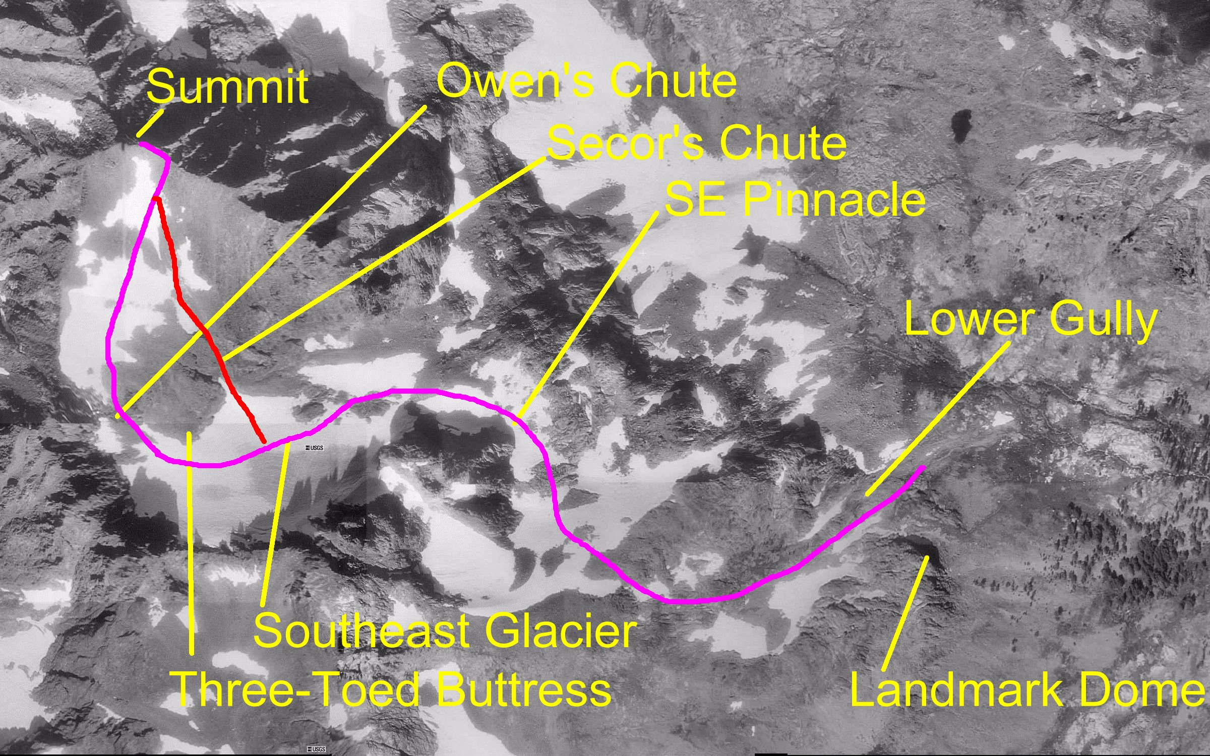 In the USGS photos, the stream flowing out of the Ritter/Banner Glacier is readily visible, and the division of the stream where it flows around a bump in its valley is a good landmark for the start of the climb. Looking southwest from that point, you will see the "landmark dome" which marks the south (left) side of the lower gully. As described above, you ascent the gully nearly to the ridge above it, then turn right and contour around the pinnacle at the southeast corner of the Southeast Glacier. From there, you have the choice of the standard Secor route (annotated in red on the aerial photo) or the easier (in my opinion) route up Owen's chute. Once into the upper bowl, attaining the summit ridge is either a snow or talus slog, depending upon the time of year and amount of remaining snow cover. From what we saw, you would want to hit the ridge a bit to the right (east) of the summit and follow the ridge to the summit, proper. I'll have to wait until 1999 to determine that for certain, of course! |