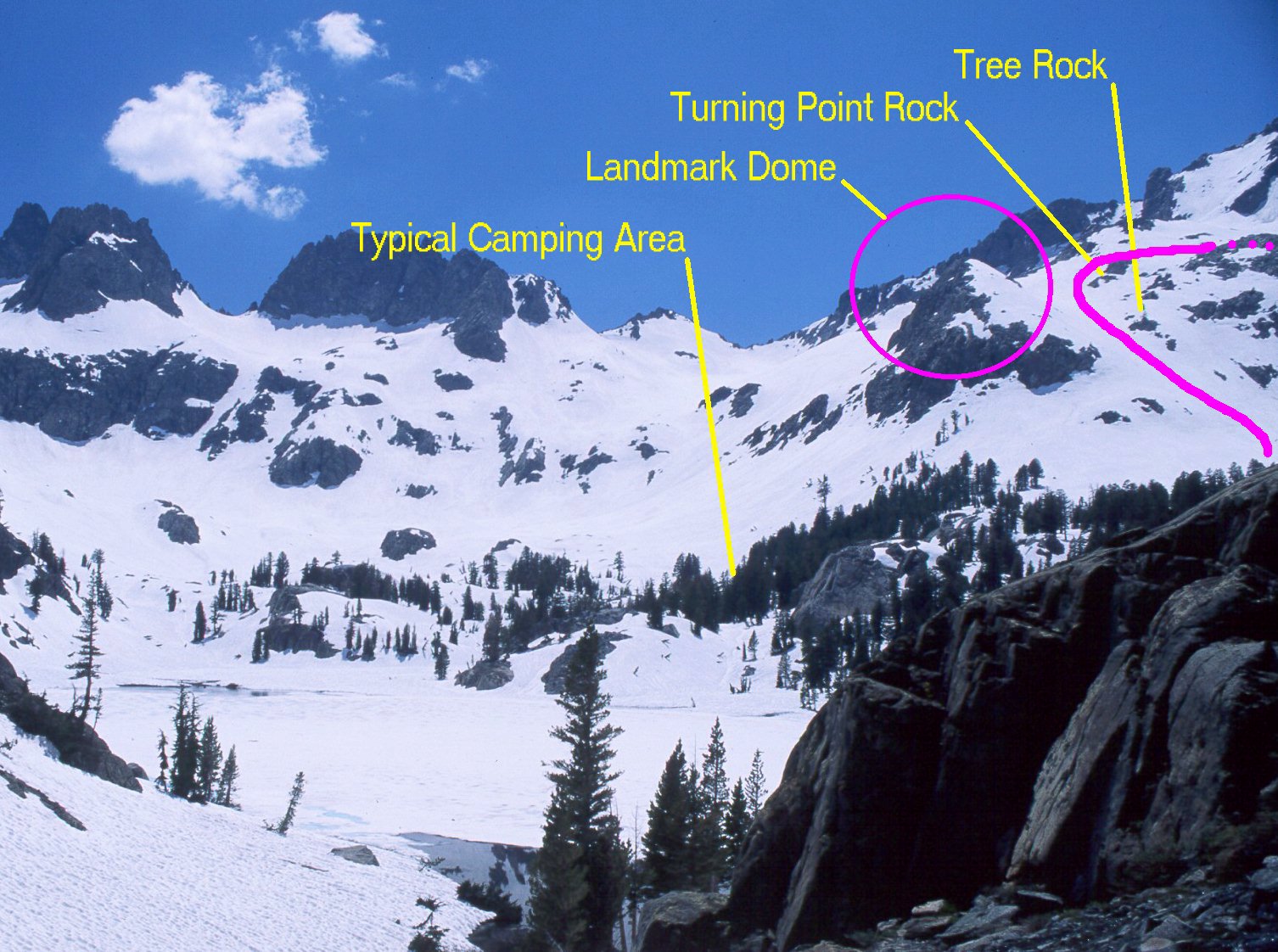| The climb back down was uneventful, but once we got down to the still snow-covered meadow above Ediza, we had a bit of difficulty locating our campsite without the usual summer landmarks, so it was 6:30 by the time we reached camp again. | |