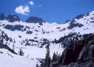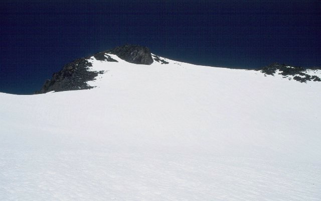 | In a normal year, this view would be of an alpine meadow, a small creek which flows out of the Ritter/Banner glacier, and rocky slopes up to the low cliffs in the center and right, leading up to the southeast glacier. 1998 was a bit different, as the creek was barely visible as a smooth indentation in the suncupped snow, and the gully, to the extreme left in this shot, was still totally snow-filled. |