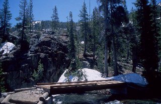 | The John Muir Trail crosses the Shadow Creek Trail (and Shadow Creek) on its way down to Red's Meadow. These four-foot drifts of snow across the JMT on the south side of the bridge were typical of the area immediately above Shadow Lake, at about 8,800' (2675 meters). |