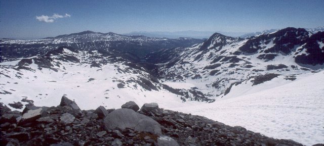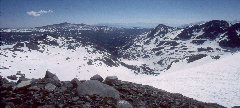 | From the outcrop, there is a terriffic view to the east, with the still-snowbound Nidyver Lakes to the left and Ediza lower and just to the right of center. | |
