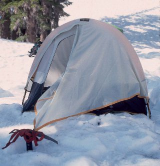 | Yes, that really is my 75cm REI Mountain Axe buried to the head as a front tent stake for my summer tent! It was nowhere near bottomed out, either! We were glad that Yehuda had brought his shovel, too, as there was quite a bit of landscaping (snowscaping??) required to level out spots for the tents. The snow at least made for comfortable sleeping and no worries about those sneaky Sierra rocks and pinecones that crawl under your tent and lodge right under your hip in the middle of the night!! |