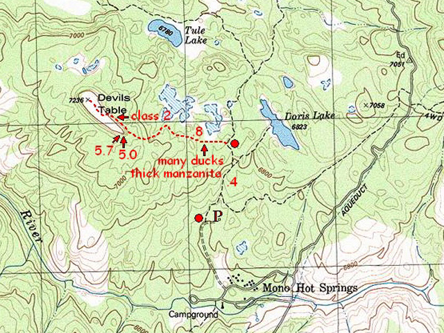 Devils Table is a small volcanic formation in the San Joaquin drainage in the Central Sierra. This often overlooked feature is found in the rolling tablelands near Mono Hot Springs and is visible from many viewpoints on the way to the popular trailheads at Florence Lake and Lake Edison. I had always wondered if it shared similar features with the more famous Devils Postpile 20 miles north. I finally had my chance to explore Devils Table while on a day trip to Lake Edison to drop off a food resupply for an upcoming Muir Trail hike. After dropping off the package at the Vermillion Resort, I stopped at Mono Hot Springs and parked at the trailhead to Doris Lake. I hiked up the trail for a half-mile, staying left at two trail junctions. Just before a saddle near two shallow lakes, a series of ducks led west, wandering through thick manzanita another half mile to the table. The formation featured rough vertical columns rising 30 to 80 ft above the surrounding terrain with an isolated flat top. I immediately selected the most obvious route on the prow of the formation. This 30 ft route (The Prow 5.0) ascends cracks and ledges up the left side of a detached pillar. Standing on top of the pillar, a mantle up the wall above gains the top of the table. I also climbed a clean double crack system ten feet left, calling it Full Steam Ahead 5.7. Further exploration of the flat sandy summit revealed a much easier class 2 route at the mid-point of the northeast face. Numerous claw marks on a tree growing next to the northwest side appeared to provide a passage for the local mountain lion. I noticed a recent set of boot tracks wandering across the broad sandy table, but found no register. With Mono Hot Springs about a mile and a half away, hikers must visit this unique formation regularly. The short hike to Devils Table is definitely a worthwhile side trip when visiting this part of the Sierra.