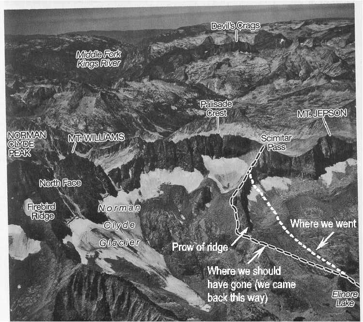 As expected, the correct way back was a breeze. The snow was very deeply sun cupped so we had to be careful, but the slope was relatively gentle and posed no problems. Our route took us around the prow of the ridge, through what is effectively a gap, since the ridge continues on the other side of this gap for a way. I think a better description for the ascent from Elinore Lake is not to hear for a flat spot, but to head around the prow of the ridge, through the obvious gap there. The accompanying photo shows the details. This photo was copied from page 181 in R.J. Secor's book (with his approval) and it also appears on page 214 of the 2nd Edition.