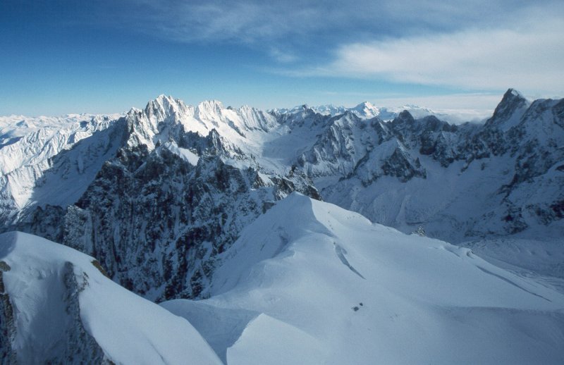 Turning 90 degrees or so, and looking past the edge of the cloud bank, this panorama of peaks, pinnacles, and glaciers spreads out below L'Aguille du Midi. |