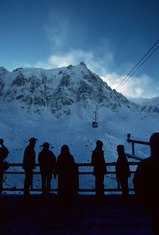 I had a business trip to Geneva, Switzerland, in mid-November, 1999, and had a free day on Saturday, 20 November. When I checked with the tour desk at the hotel (Movenpick, by the airport which is nice, but $$$), they had an all-day bus trip down to Chamonix, with a cable-car ride up to the top of L'Aguille du Midi, on the slopes of the Mont Blanc massif. |