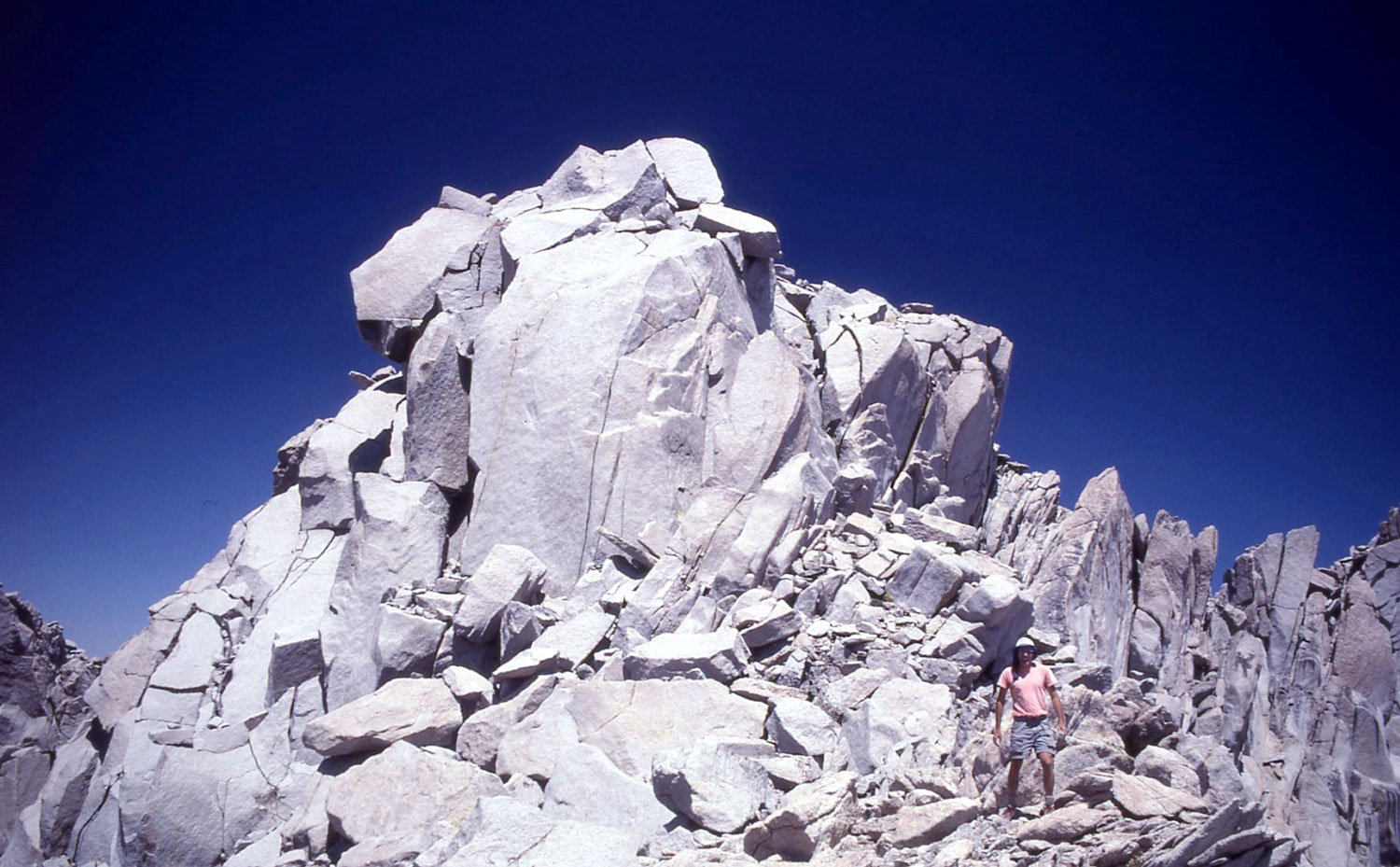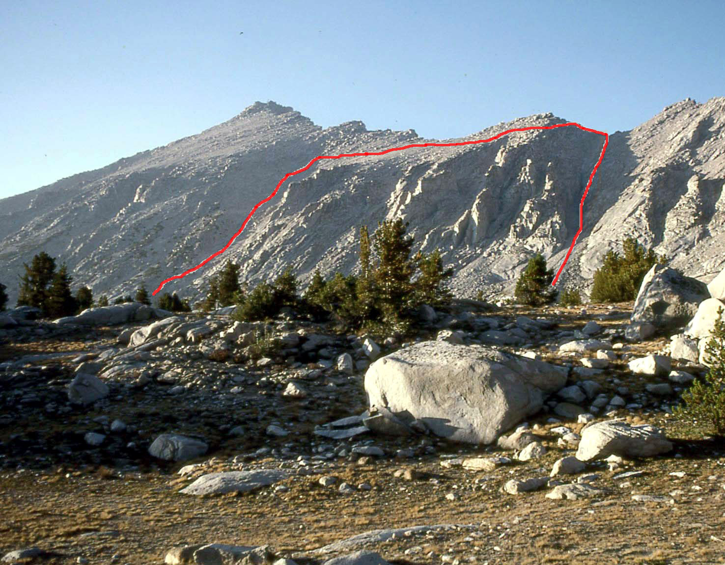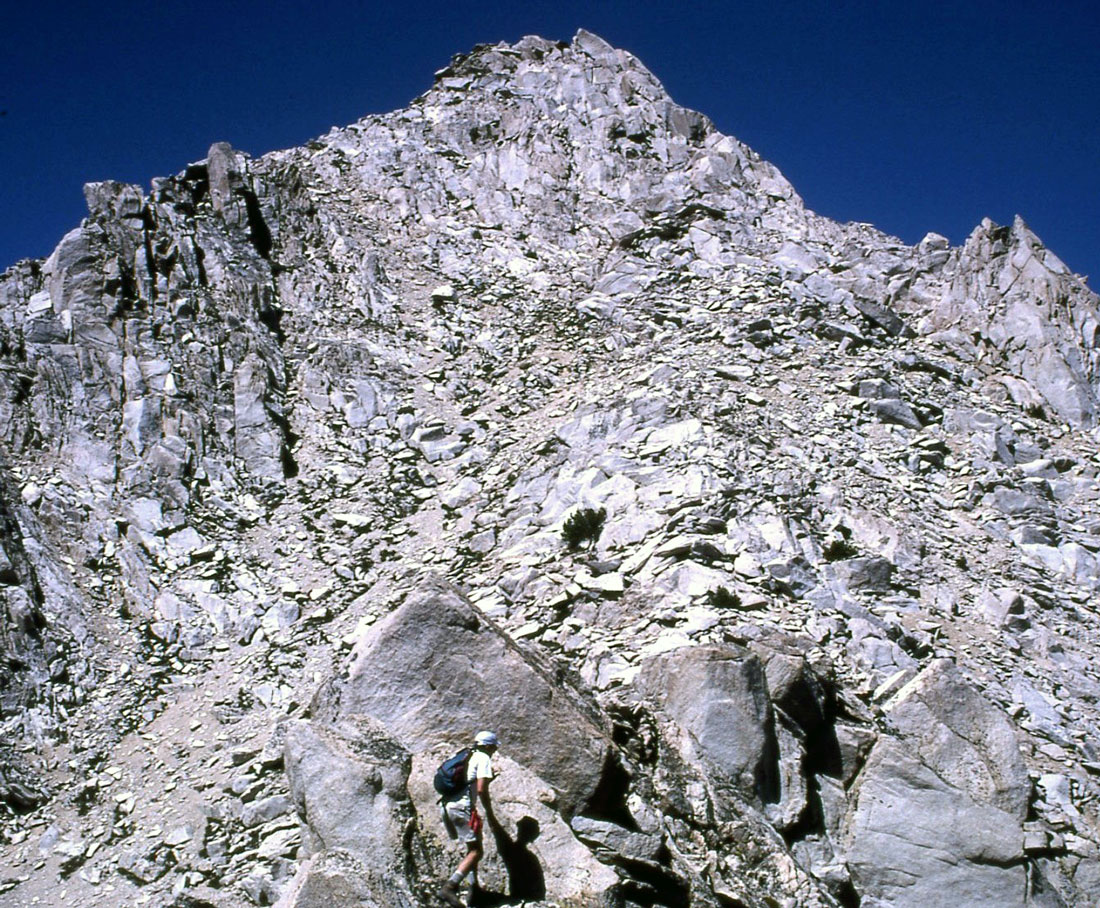 Third Day, East Vidette: The next morning we left our scenic Vidette Meadows campsite and moved our camp up the trail about a mile to the next bear box (9,900'), which was close to the base of East Vidette. We set up a quick camp and dropped our food in the bear box and headed back up the trail towards East Vidette. After reviewing the route descriptions we decided to try a route in between the southern approach to the East Ridge and the Tidball east face chute. We climbed up increasingly steep slabs that rose from Bubbs Creek and aimed for the solid rock that was just north and below the gendarme on the East Ridge. Several hundred feet of steep and enjoyable class 3 climbing brought us up to the north side of the gendarme and then onto the East Ridge. To keep the climb interesting class 3, we stayed directly on the ridge until it ended at a notch. From the notch we climbed several hundred feet up along the right side of a chute that brought us onto the south ridge of the peak. A hundred feet or so of somewhat intricate up, down, around to the right and then to the left brought us to the summit area where we were surprised to see several large angular summit rocks. The final move to the 12,563' summit was class 3, but there was a significant amount of exposure down the 2,000' north face if you slipped. Fortunately, the register was adjacent below in a more relaxing spot. There were no ascents in the register for three weeks, which surprised me. This peak was one of the more enjoyable peaks that I've climbed in a while with good quality solid rock and moderately challenging route finding. Time up from our camp was 2.5 hours. We made our descent down the south ridge and chute that we had ascended to the notch but decided to try the south face since it looked like a quick descent down the sand and scree slope. It went fine for 1,000' until we noticed that there was a cliff band below us and there we stopped and carefully looked for a route. Near the bottom of this south slope there is a short class 3 ledge and gully system that heads down to the west and cuts through the cliff band to the talus bowl below. Secor rates this route class 1 but there did not appear to us to be a class 1 route up this side, may be class 2-3. Once in the bowl it was a quick descent through the talus, down the slabs near the creek, around the East Ridge, down to the Bubbs Creek crossing and back to camp. Great climb, perfect weather!