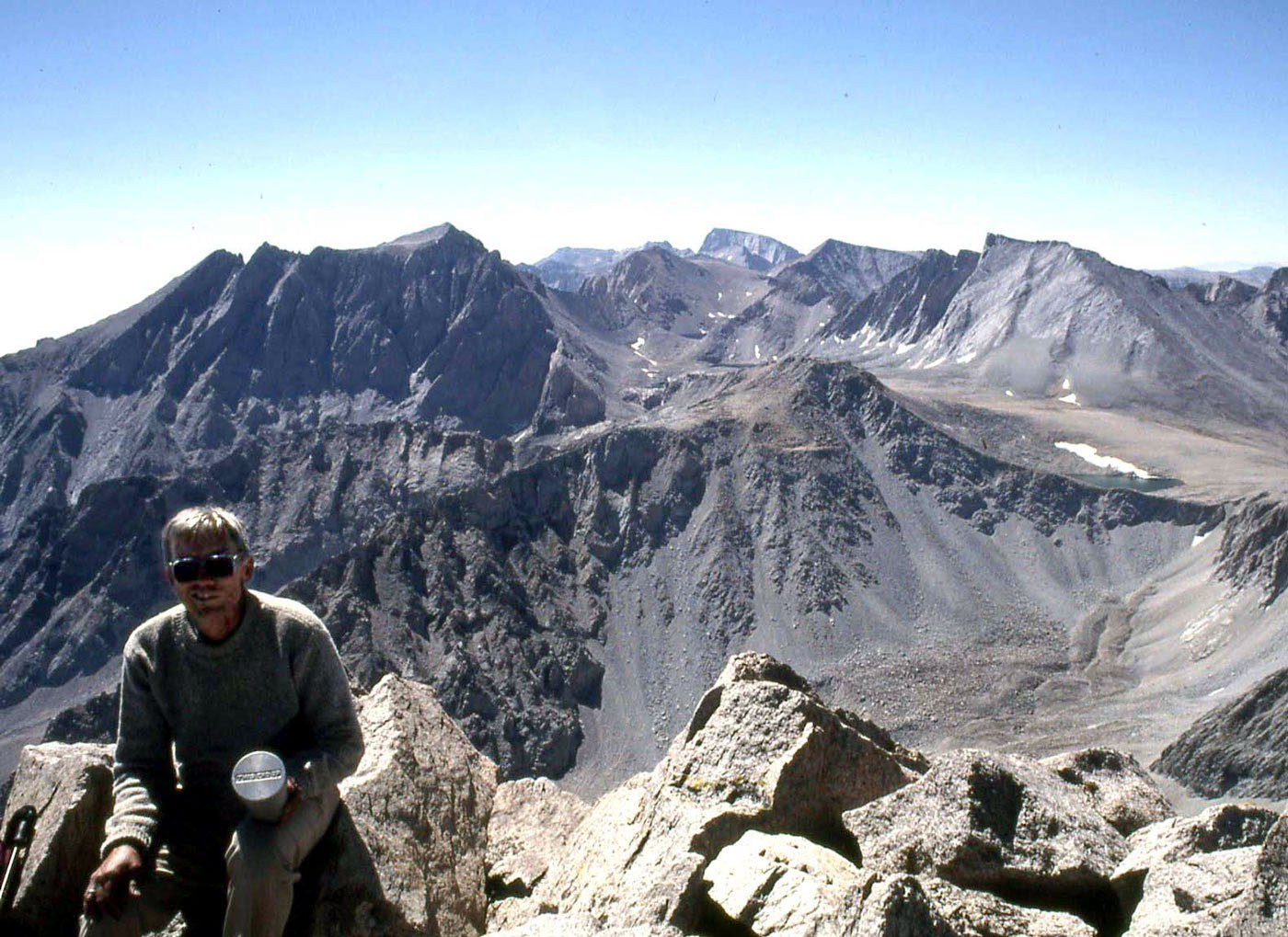 Fifth Day, Mt. Keith: Early the next morning we crunched our way over the frozen grass and meadow towards the black cliffs on the northeast base of Mt. Keith. Along the way we found a small solitary bear print frozen in the mud along a tarn between Bradley and Keith. We climbed the right side of the large talus pile that was just to the left of the black water stained cliffs. At the top of the talus we found a ledge system that ran to the right across the top of the lower cliff band that provided an easy way for us to access the northeast bowl. A short walk above the cliffs soon brought us to a wonderful scenic meadow campsite at 12,400' with grassy sand flats with a cold stream along side. After this, the typical steep, unstable talus dominated our 1,000'climb up the slope, which was south or left of a dominant ridge up to a sandy saddle at the base of the summit mass. This saddle, which is at 13,500', has a great view to the south of Mount Williamson, which is only three miles across the deep gulf containing the Shepherd Pass trail far below. For those of you that have ever drank from the only reliable creek on the Shepherd Pass Trail below Anvil Camp this sandy slope is the source for that cool, clean water. The final climb up to the summit was a low angle sand climb occasionally interrupted by a few boulders until we reached the summit mass at 13,977'. Total time from our camp was 3.5 hours. The views were great and ranged from Goddard, Darwin and the Palisades in the north to the smoke enveloped Great Western Divide in the South.