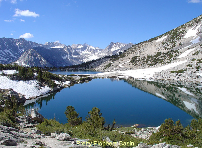 On Mon, 7/5, we planned to hike out along Golden Creek to Mono Pass, but changed our mind since there were steep frozen snow slopes on which a fall without ice axe would have ended the trip in a deep, cold lake. So we detoured along the standard route past Trail Lake and were safely back at Mosquito Flats before noon. This ended a fine trip with a visit to three Pioneer peaks in the lovely Pioneer Basin.