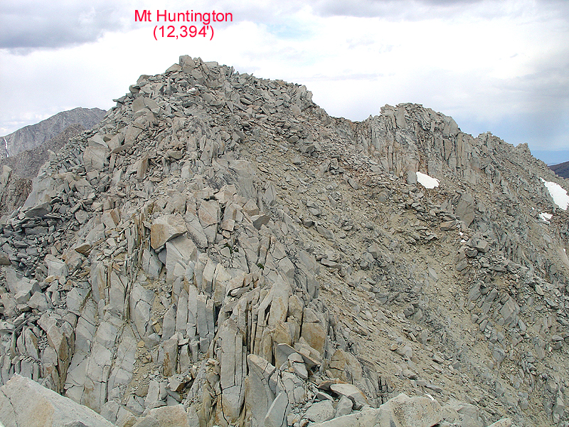 On Sun, July fourth, we ascended Mt Hopkins via its southeastern slopes from the lower Pioneer Lakes. Running the ridge from the south we traversed several false summit blocks to finally reach the real 12,304' summit, which involves a short cl 3 scramble. This easy peak sees a lot of traffic. It had a PVC type register can with several booklets full of names, but hardly any familiar SPS names. Yet, this peak is just as pretty as the listed Pioneer peak, Mt Stanford. I skipped that one on this weekend since I had done it twice before, last year on skis ( http://angeles.sierraclub.org/skimt/trips/stanmor03/stanmor03.htm ). From 9-10am we enjoyed being on the summit of Mt Hopkins. Then we descended a chute to the nearest Pioneer Lake, which involved 1000' of soft sand glissading, almost as much fun as skiing. After lunch we broke camp and hiked up to Golden Lake. We camped near the outlet and had the lake to ourselves. Fishing was unsuccessful since in this high altitude lake (11,000') there were tadpoles and only a few brown trout, which had no interest in bait, lures or flies.