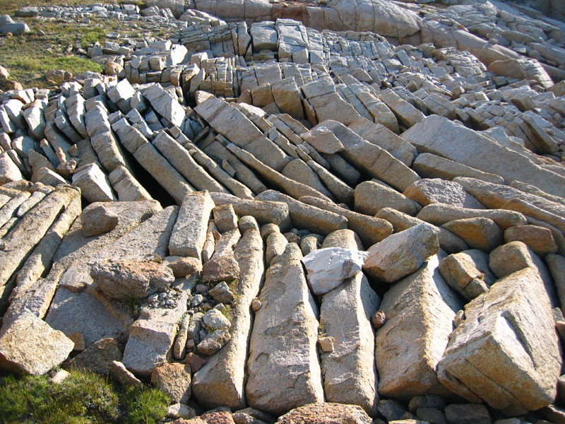 | The big problem for us was that we couldn't figure out how to protect the summit from below. (Last time I was here I had a top rope belay and did the step-across on the way up, then rapped off. No idea how the top rope was set up.) I climbed down and walked all the way around the summit blocks (three enormous slabs just leaning against each other) looking for some way to toss a rope over the top securely. The first person would have to free climb it and no one volunteered. |