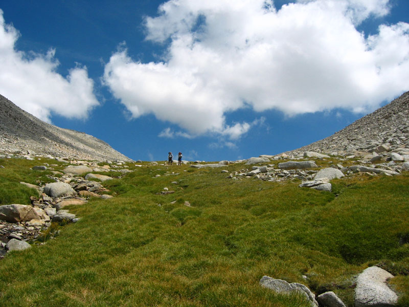 With storms every day, growing in intensity, we opted for an easy descent to Colby Lake instead of our intended cross-country return. Thunder, Brewer, North Guard, and Farquhar would have to wait for other trips. We stayed northwest of Lake 3512's outlet stream, mostly in tundra and duff all the way to the trail around Colby. After the required "ooh and aah" stop near the outlet, we scampered down the trail toward Whaleback and Big Wet Meadow as the storm closed in behind us. We received only sporadic sprinkles and made it down around 8600' where we camped in a developed horse camp somewhere near Cement Table Meadow.