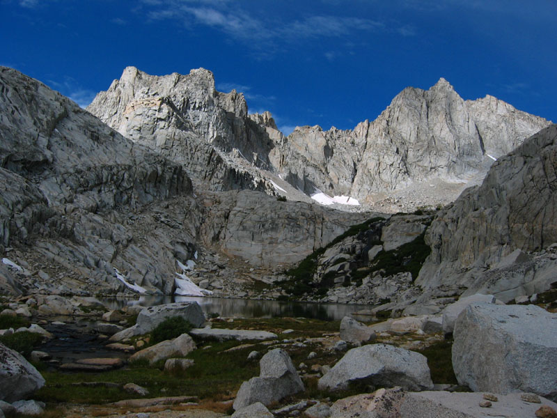 After repacking and trying to convince the downward-bound packer clients that those puffy clouds wouldn't STAY puffy (they packed away their rain gear) I headed up to Lake Reflection to scout around and drop off a cache of climbing gear and food. The cache wasn't really necessary, but it meant I'd be climbing with a smaller pack the next day and we wouldn't have to scout the route.