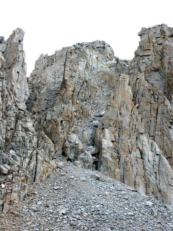 | Secor's book says to climb "the easternmost chute on the south side of Table Mountain's west ridge" and we had a long discussion about which of the chutes was the easternmost. Let me make it simple: There are two branches of the eastern chute which feed the same talus fan (splitting at about 12.7k), as shown in this picture. The left branch is technically not the most eastern, but it's the correct one. Both branches go as third class, but the right branch starts with 30' of hard climbing while the left branch starts easy but looks like there's a hard chockstone about 100' above the split. It turns out that the chock isn't hard at all! Take the left branch. |