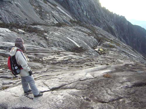Kuinten had mention that there have been times where a sudden rain storm has cut off the route back down to Laban Rata. These huge sheets of granite collect the torrential tropical rain storms and they funnel into only a few gullies. One of these gullies passes right next to the Sayat checkpoint hut. It's basically an instantaneous flash flood that can be a few feet deep and rushes right over the edge of the dome. The pictures a show the gully past the Sayat checkpoint (left) and a gully down the other side of the dome (right).